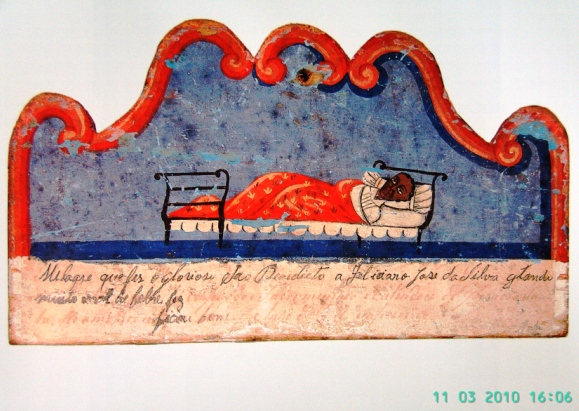 Ex-voto pictórico. “Milagre que fes o glorioso São Benedito a Feliciaro Jose da Silva quando muito mal de febre fez ficou bom”.