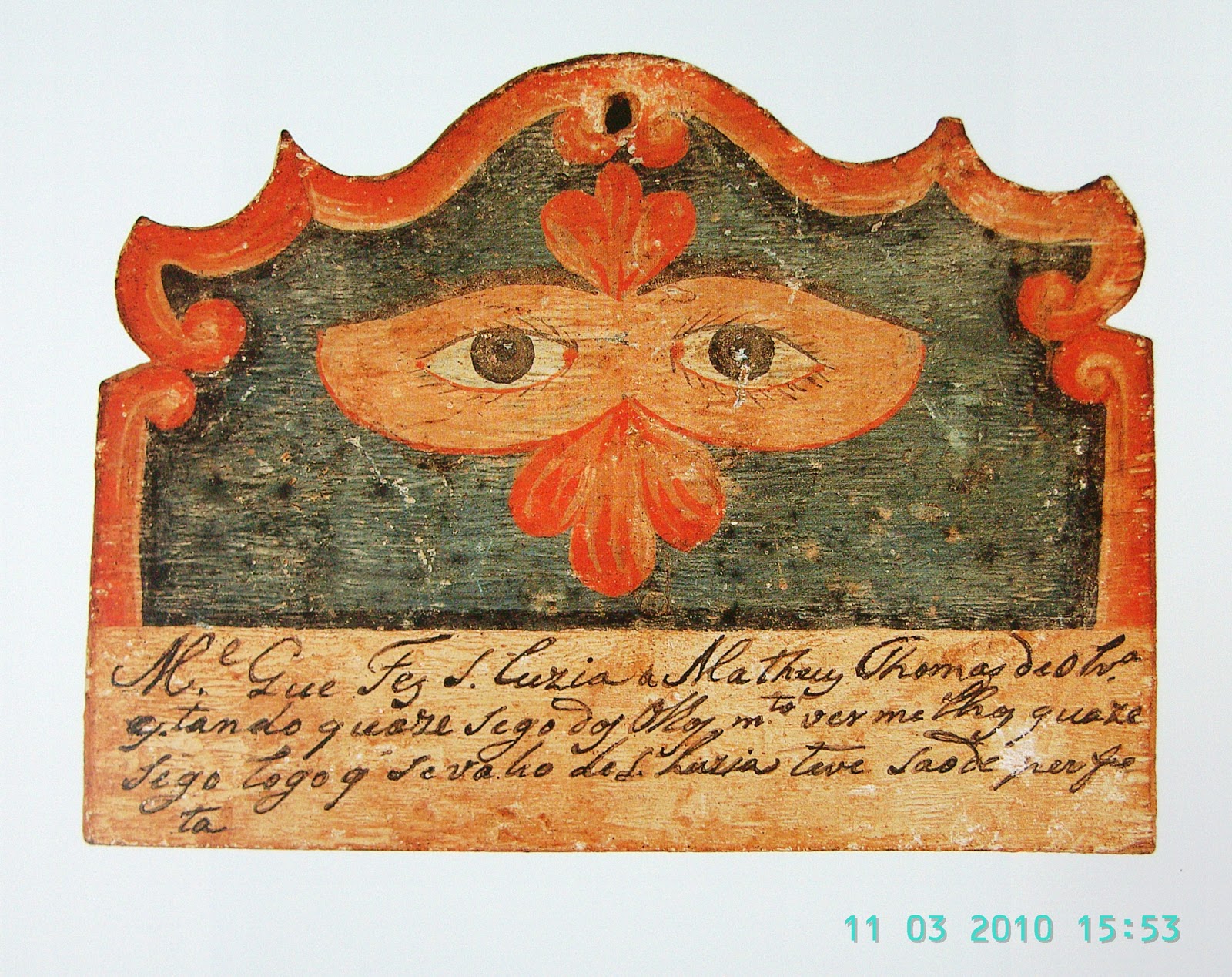 Ex-voto pictórico. “Milagre Que Fez S. Luzia a Matheus Thomas de Olvª quando quase sego dos Olhos muito vermelhos, quaze sego. Logo que levado ded Luzia teve saúde perfeita.”