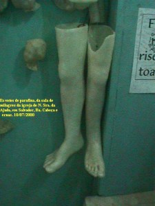Ex-voto antropomorfo de parafina monocromática branca, forma de pernas. Na sala de milagre da igreja N. Sra da Ajuda