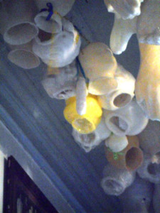 Ex-votos em formato de cabeças e mãos no teto do santuário.
