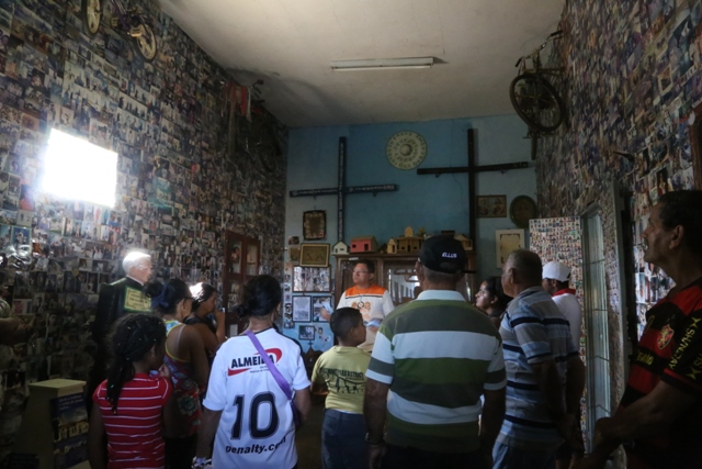 Sala com dezenas de ex-votos fotográficos sendo visitada