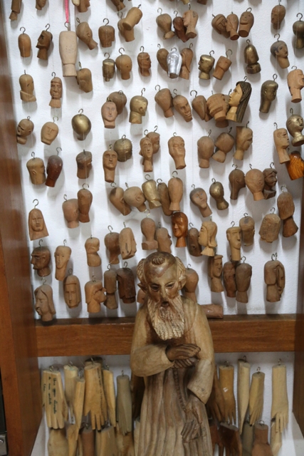 Imagem de um senhor cercado por ex-votos de cabeças humanas em madeira