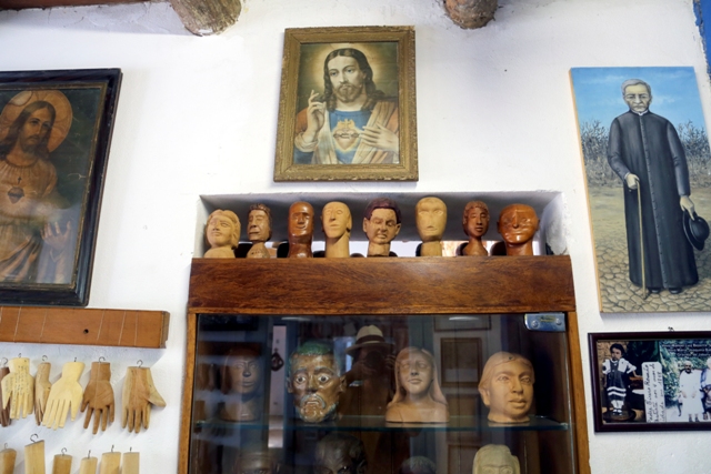 Conjunto: fotos do Sagrado Coração de Jesus, do Pe. Cícero e ex-votos em madeira