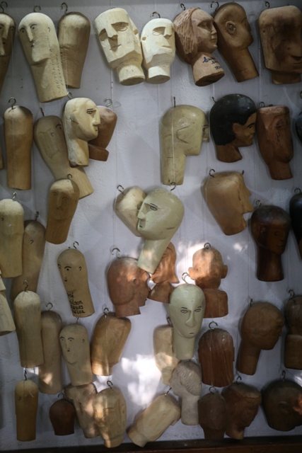 Acervo com pequenos ex-votos em formato de cabeças humanas.
