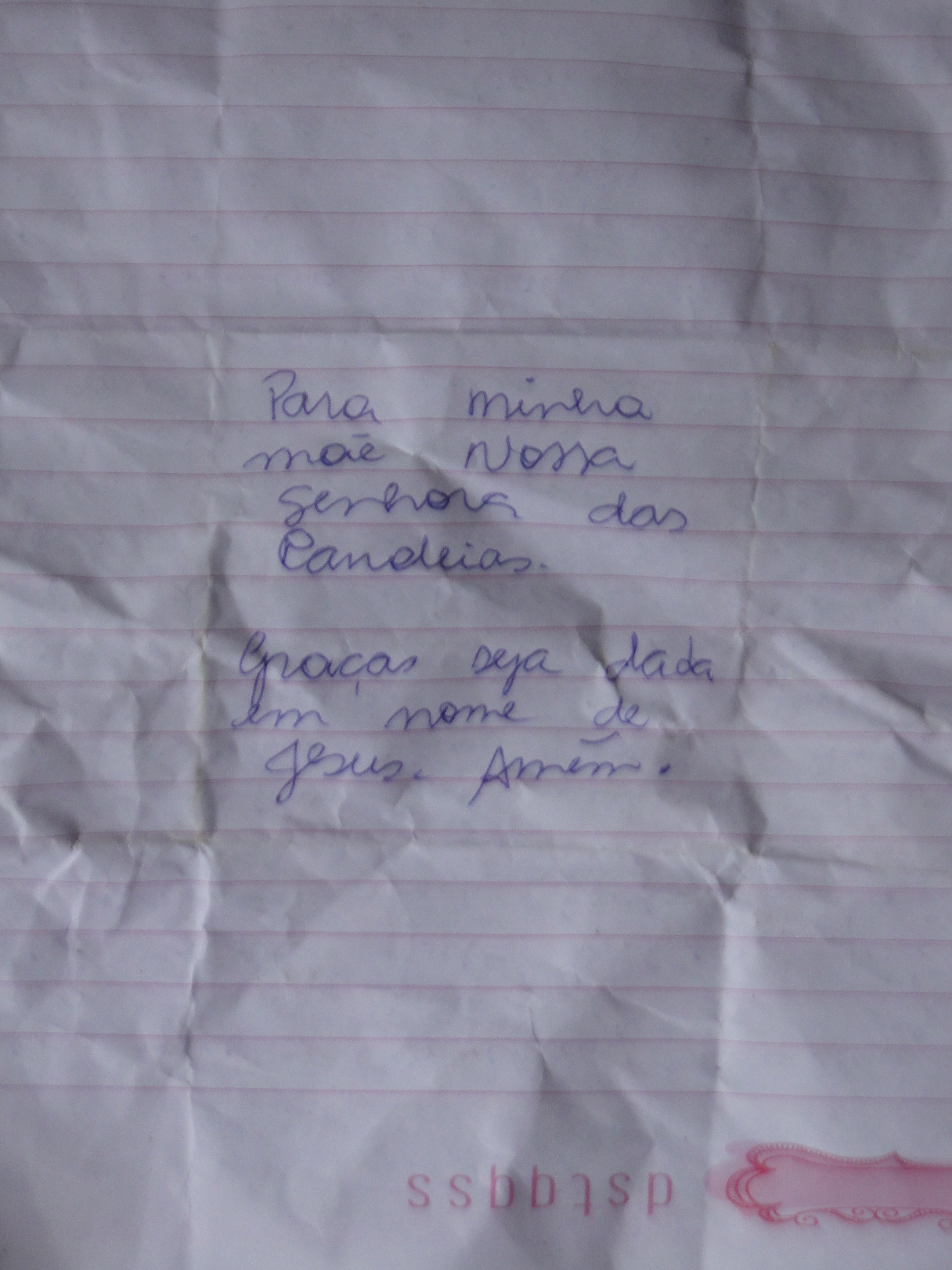 Carta ex-votiva: “Para minha Mãe Nossa Senhora das Candeias. Graça seja dada em nome de Jesus. Amém.”