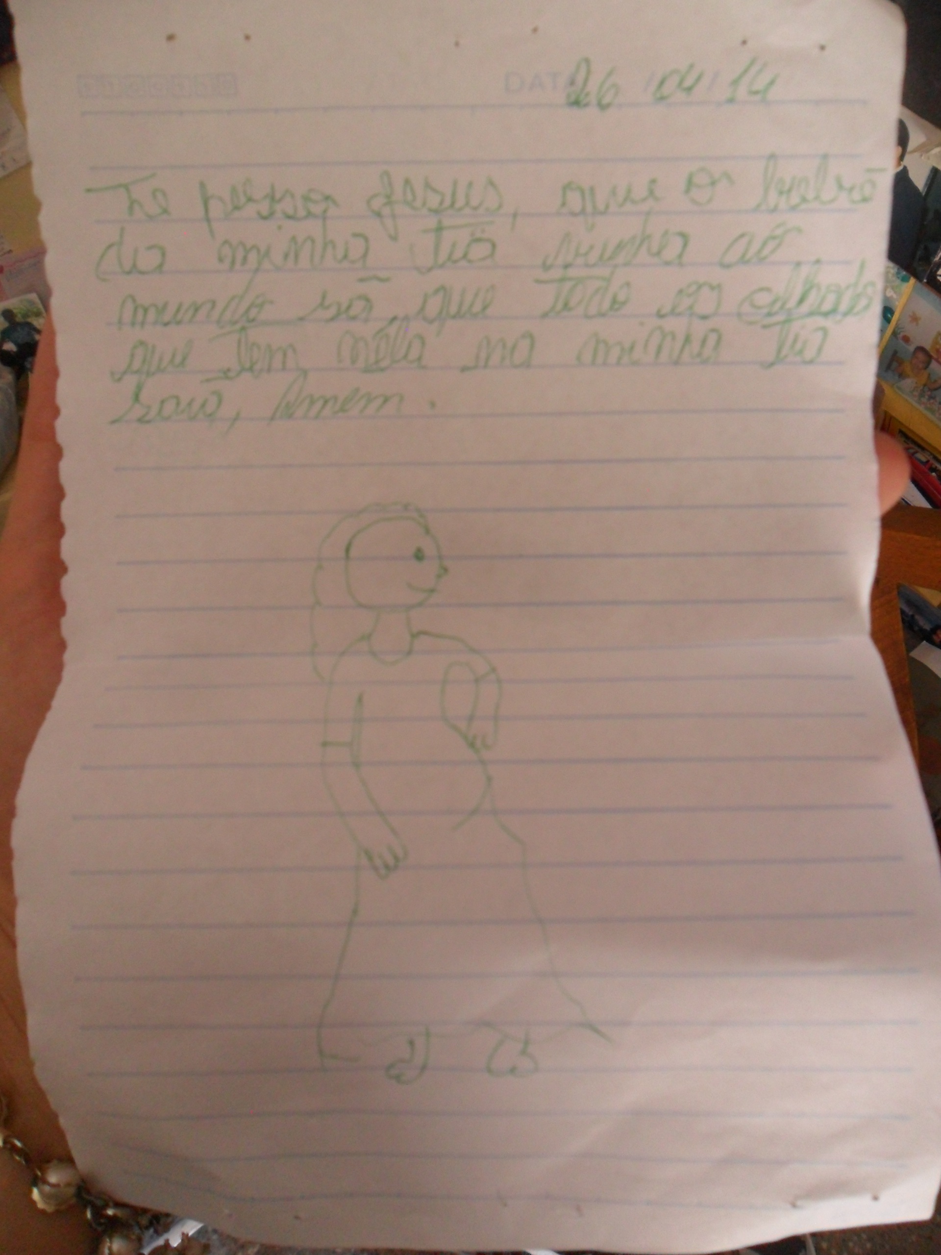 Carta votiva escrita por uma criança, solicitando a Jesus que o bebê de uma tia venha ao mundo. Abaixo do pedido foi feito um desenho, com caneta verde, de uma mulher grávida.