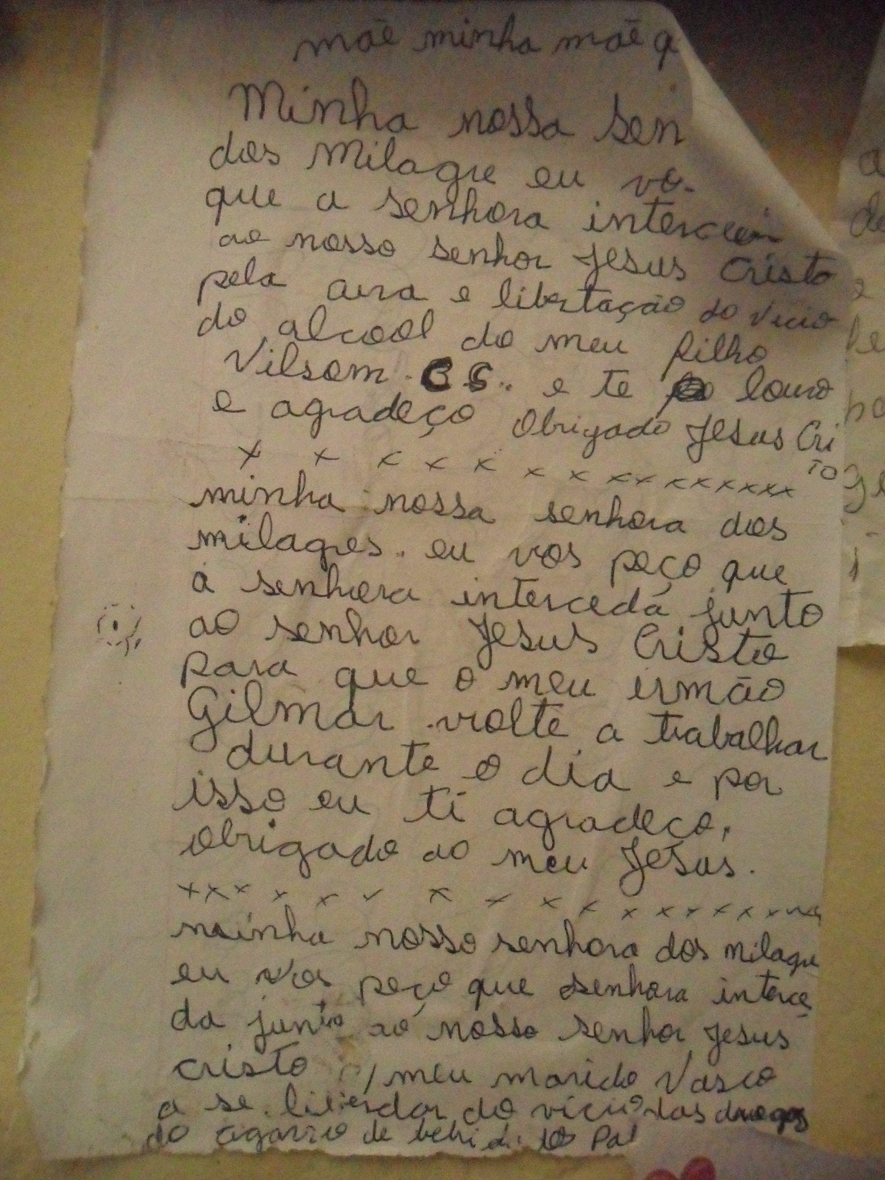 Carta ex-votiva escrita por uma mulher para Nossa Senhora dos Milagres, solicitando que o marido abandone o vício das drogas.