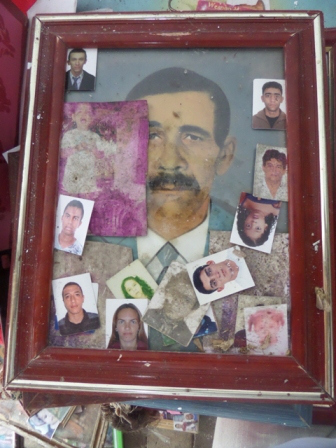 Curioso quadro com fotografia antiga emoldurada, representando um homem e, ao redor, diversas fotografias 3×4 de outras pessoas.